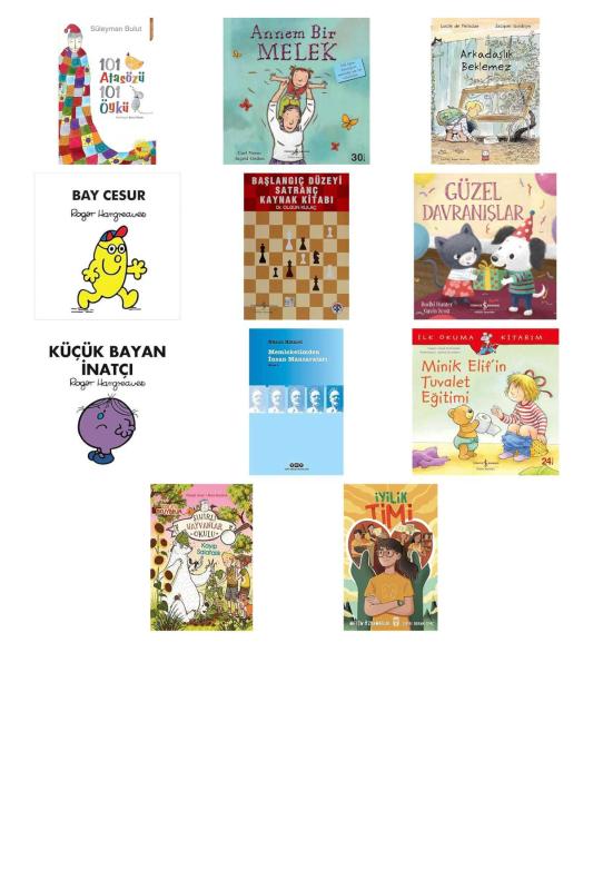 101 Atasözü 101 Öykü - Annem Bir Melek - Arkadaşlık Beklemez - BAY CESUR - Başlangıç Düzeyi Satranç Ders Kitabı - GÜZEL DAVRANIŞLAR - Küçük İnatçı - Memleketimden İnsan Manzaraları: Şiirler 5 - Minik Elif’in Tuvalet Eğitimi: İlk Okuma Kitabım - Sihirli Hayvanlar Okulu - Kayıp Salatalık - İyilik Timi