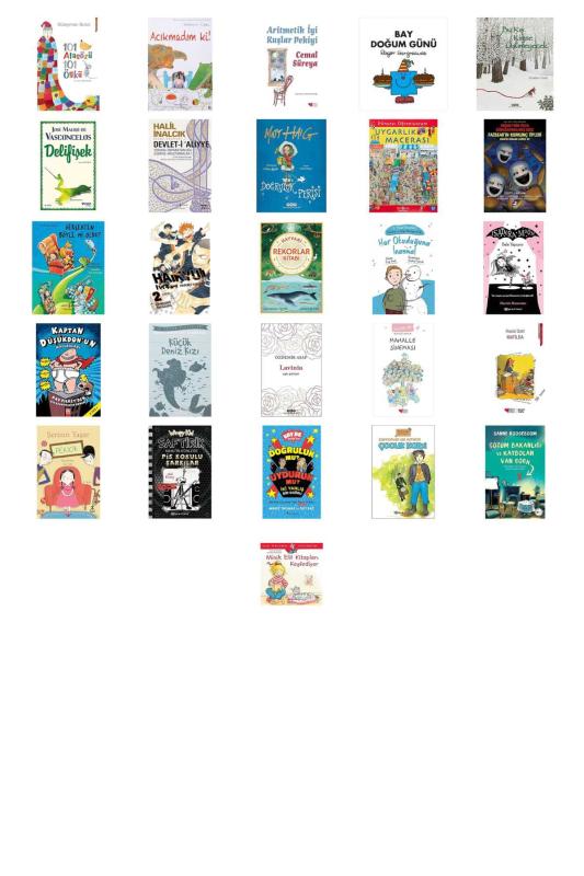 101 Atasözü 101 Öykü - Acıkmadım ki!: Waterstone Resimli Kitap Ödülü - Aritmetik İyi Kuşlar Pekiyi - Bay Doğum Günü - Bu Kış Kimse Üşümeyecek - Delifişek - Devlet-i Aliyye - I: Osmanlı İmparatorluğu Üzerine Araştırmalar 1 - Doğruluk Perisi - Dünyayı Öğreniyorum - Uygarlık Macerası - Fazbear'ın Korkunç Tipleri Grafik Roman Serisi 2 - Freddy'nin Pizza Dükkanı'nda Beş Gece - Gerçekten Böyle mi Oldu?: Eğlenceli Ara Bul Kitabı - Zaman Yolculuğu - Haikyu 2. Cilt: Zirvedeki Manzara - Hayvani Rekorlar Kitabı (Ciltli) - Her Okuduğuna İnanma!: Çocuklar İçin 21. Yüzyıl Becerileri – Teknoloji ve Bilgi Okuryazarlığı - Isadora Moon - Bale Yapıyor - Kaptan Düşükdon’un Maceraları - Küçük Deniz Kızı: İş Çocuk Klasikleri Kısaltılmış Metin - Lavinia - Aşk Şiirleri - Mahalle Sineması - Matilda: 9+ Yaş - Pekicik - Saftirik Greg’in Günlüğü 17: Pis Kokulu Şarkılar - Vay Be Dünya! 1 - Doğruluk mu? Uyduruk mu? İki Yanlış Bir Doğru - Çocuk Kalbi - Çözüm Bakanlığı ve Kaybolan Van Gogh - İlk Okuma Kitabım - Minik Elif Kitapları Keşfediyor