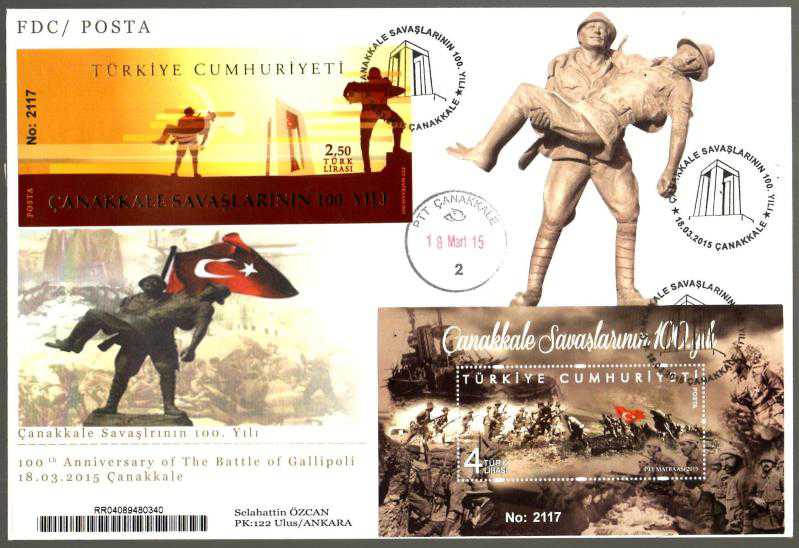 10557 2015 ÇANAKKALE SAVAŞLARI'NIN 100.YILI NUMARALI BLOKLAR TAAHÜTLÜ VARIŞLI başlıklı ürün, Efemera, Müzik, Sinema > Pullar, Zarflar, Kartlar > İlk Gün Zarfı (FDC) > Yerli FDC kategorisi altında Yeni olarak satılmaktadır.