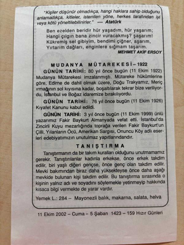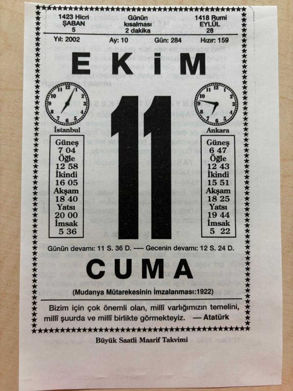 11 EKİM 2002 - TAKVİM YAPRAĞI - DOĞUM GÜNÜ HEDİYESİ - BÜYÜK SAATLİ MAARİF TAKVİMİ - ATATÜRK - MEHMET AKİF ERSOY - MUDANYA MÜTAREKESİ - KIYAFET KANUNU KABUL EDİLDİ - YAZARIMIZ FAKİR BAYKURT ALMANYA'DA VEFAT ETTİ - TANIŞTIRMA ADLI YAZI, 8 ay önce satışa sunulmuştur.