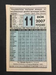 11 EKİM 2007 -TAKVİM YAPRAĞI-DOĞUM GÜNÜ HEDİYESİ-FAZİLET TAKVİMİ,MUDANYA KONFERANSI VE MUDANYA MÜTAREKESİ,1922,BAYRAM NAMAZI NASIL KILINIR,BAYRAM GECELERİ NE YAPMALI başlıklı ürün, Efemera, Müzik, Sinema > Belge ve Evraklar > Takvimler kategorisi altında İkinci El olarak satılmaktadır.