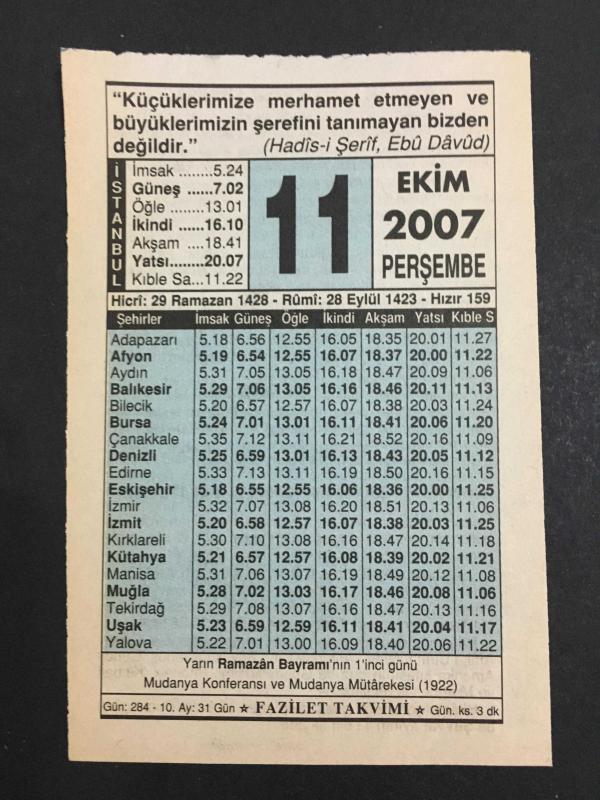 11 EKİM 2007 -TAKVİM YAPRAĞI-DOĞUM GÜNÜ HEDİYESİ-FAZİLET TAKVİMİ,MUDANYA KONFERANSI VE MUDANYA MÜTAREKESİ,1922,BAYRAM NAMAZI NASIL KILINIR,BAYRAM GECELERİ NE YAPMALI, en son 8 ay önce güncellenmiştir.