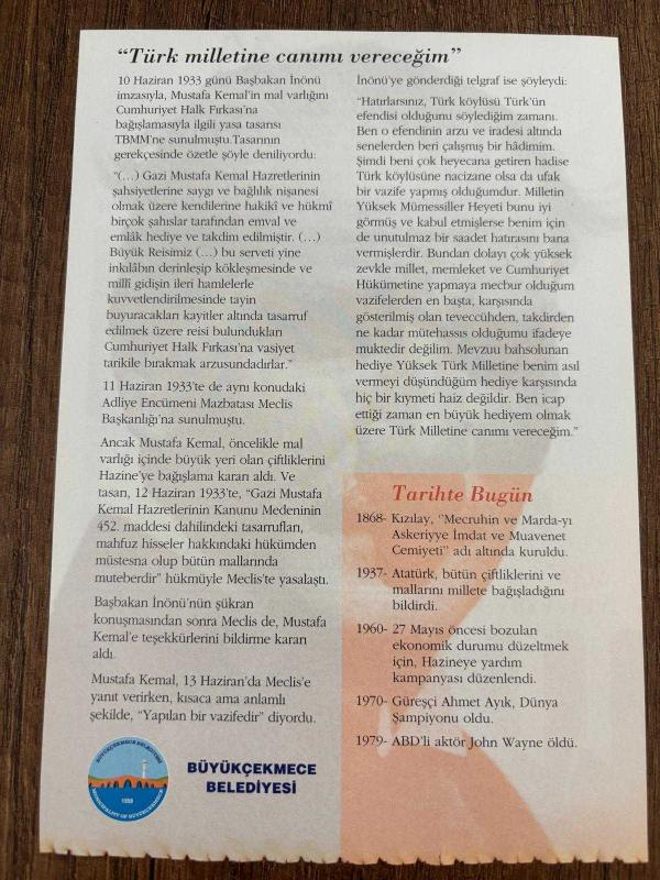 11 HAZİRAN 2008 - TAKVİM YAPRAĞI - DOĞUM GÜNÜ HEDİYESİ - GAZİ MUSTAFA KEMAL ATATÜRK FOTOĞRAFLI BÜYÜKÇEKMECE BELEDİYESİ TAKVİMİ - Bütün mal varlığını milletine bağışlamıştı - "Türk milletine canımı vereceğim" - 1868- Kızılay, "Mecruhin ve Marda-yı Askeriyye İmdat ve Muavenet Cemiyeti" adı altında kuruldu - 1937- Atatürk, bütün çiftliklerini ve mallarını millete bağışladığını bildirdi - 1960- 27 Mayıs öncesi bozulan ekonomik durumu düzeltmek için, Hazineye yardım kampanyası düzenlendi - 1970- Güreşçi Ahmet Ayık, Dünya Şampiyonu oldu - 1979- ABD'li aktör John Wayne öldü başlıklı ürün, Efemera, Müzik, Sinema > Belge ve Evraklar > Takvimler kategorisi altında İkinci El olarak satılmaktadır.