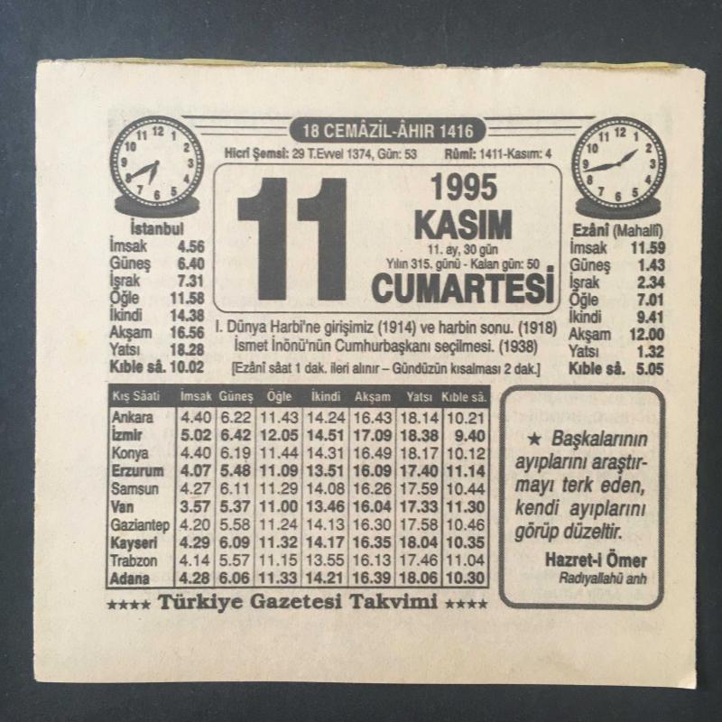 11 KASIM 1995 -TAKVİM YAPRAĞI-DOĞUM GÜNÜ HEDİYESİ-TÜRKİYE GAZETESİ TAKVİMİ,1.DÜNYA HARBİNE GİRİŞİMİZ,1914,VE HARBİN SONU,1918,İSMET İNÖNÜNÜN CUMHURBAŞKANI SEÇİLMESİ 1938,BİR İCRA MEMURUNUN HATIRALARI, en son 8 ay önce güncellenmiştir.