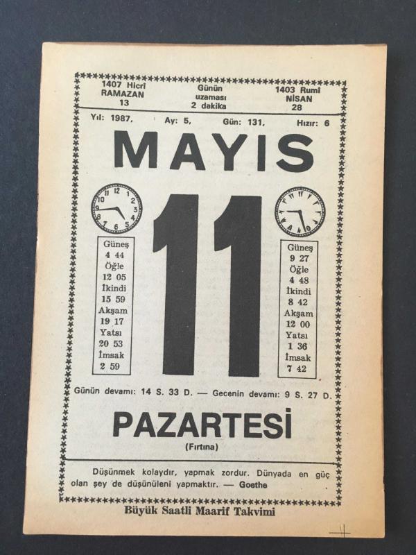 11 MAYIS 1987 -TAKVİM YAPRAĞI-DOĞUM GÜNÜ HEDİYESİ-BÜYÜK SAATLİ MAARİF TAKVİMİ,BAKTIN MI,BAHAR,ANNE ÜZERİNE BİR KAÇ SÖZ, en son 8 ay önce güncellenmiştir.