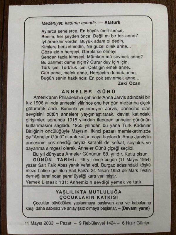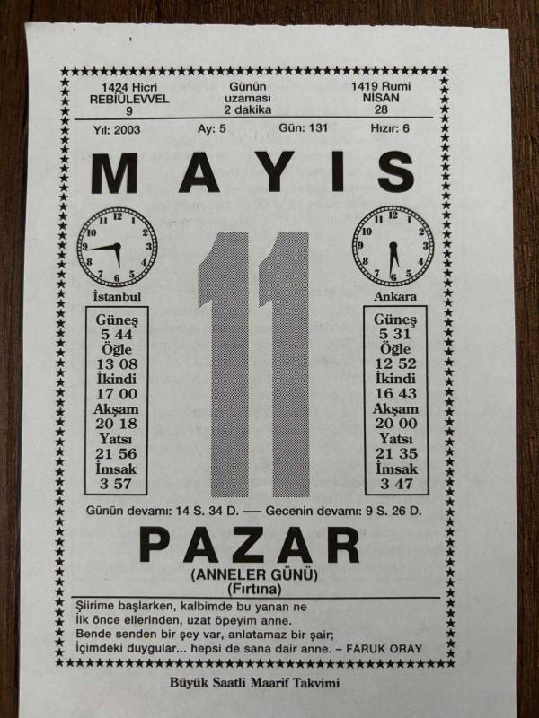 11 MAYIS 2003 - TAKVİM YAPRAĞI - DOĞUM GÜNÜ HEDİYESİ - BÜYÜK SAATLİ MAARİF TAKVİMİ - FARUK ORAY - ATATÜRK - ZEKİ OZAN - ANNELER GÜNÜ - YAZAR SAİT FAİK ABASIYANIK VEFAT ETTİ - YAŞLILIKTA MUTLULUĞA ÇOCUKLARIN KATKISI, en son 8 ay önce güncellenmiştir.