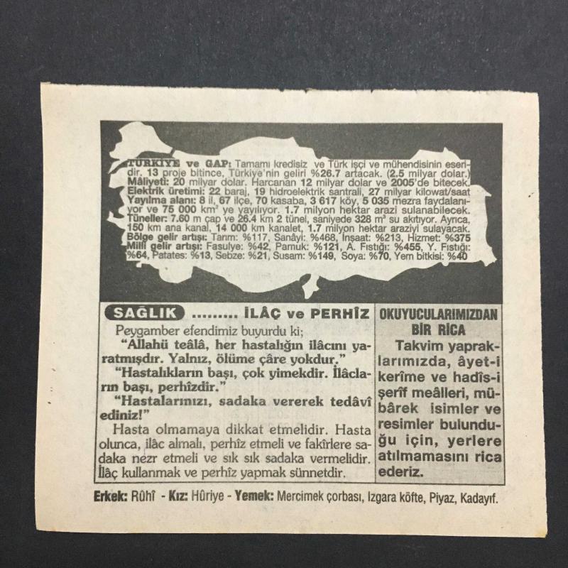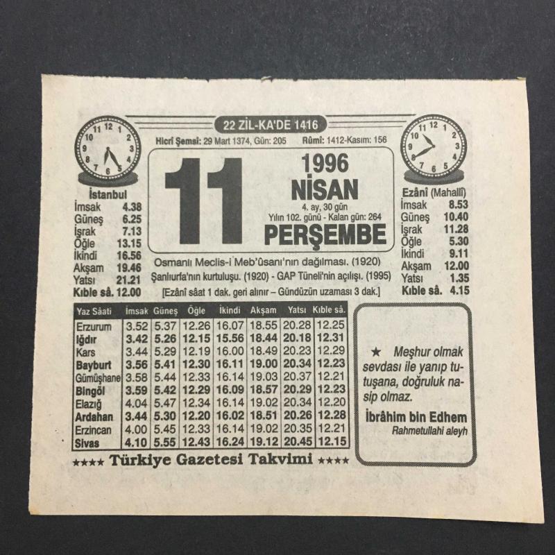 11 NİSAN 1996-TAKVİM YAPRAĞI-DOĞUM GÜNÜ HEDİYESİ-TÜRKİYE GAZETESİ TAKVİMİ,OSMANLI MECLİSİ MEBUSANIN DAĞILMASI 1920,ŞANLIURFANIN KURTULUŞU,1920,GAP TÜNELİNİN AÇILIŞI 1995,İLAÇ VE PERHİZ,TÜRKİYE VE GAP, en son 8 ay önce güncellenmiştir.