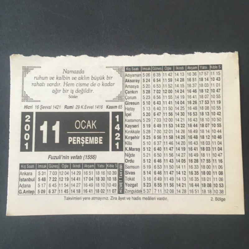 11 OCAK 2001 -TAKVİM YAPRAĞI-DOĞUM GÜNÜ HEDİYESİ-HİZMET TAKVİMİ,FUZULİNİN VEFATI,NAMAZ, en son 8 ay önce güncellenmiştir.