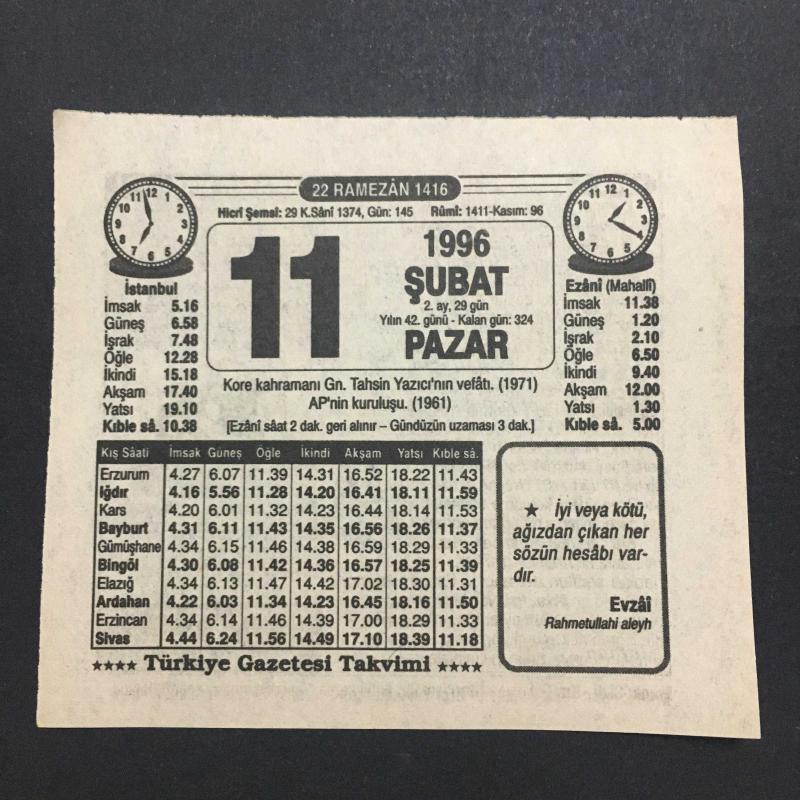 11 ŞUBAT 1996 -TAKVİM YAPRAĞI-DOĞUM GÜNÜ HEDİYESİ-TÜRKİYE GAZETESİ TAKVİMİ,KORE KAHRAMANI GN TAHSİN YAZICININ VEFATI 1971,AP NİN KURULUŞU 1961,NASİHAT,RAMAZAN MANİLERİ, en son 8 ay önce güncellenmiştir.