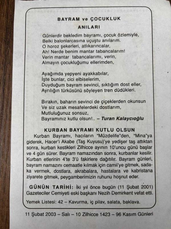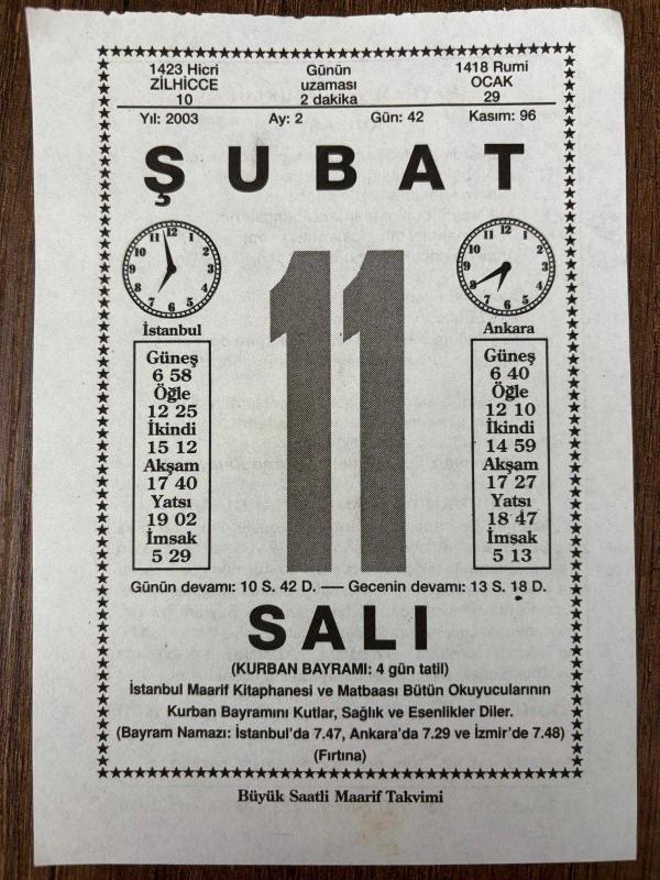 11 ŞUBAT 2003 - TAKVİM YAPRAĞI - DOĞUM GÜNÜ HEDİYESİ - BÜYÜK SAATLİ MAARİF TAKVİMİ - KURBAN BAYRAMI - TURAN KALAYCIOĞLU - NEZİH DEMİRKENT'İN VEFATI, en son 8 ay önce güncellenmiştir.