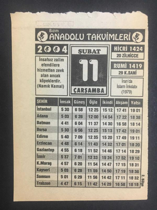 11 ŞUBAT 2004 -TAKVİM YAPRAĞI-DOĞUM GÜNÜ HEDİYESİ-BİZİM ANADOLU TAKVİMLERİ,İRANDA İSLAM İNKILABI,1979,KADERE İNANAN KEDERDEN KURTULUR