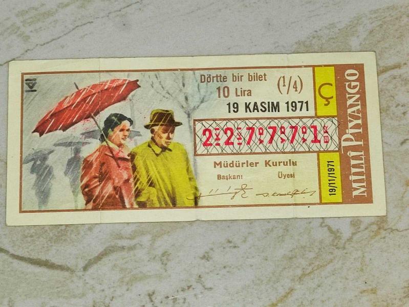 11340-MİLLİ PİYANGO BİLETİ 19 KASIM 1971 4/1 BİLET 10 LİRA **227771 NOLU BİLET, 2 ay önce satışa sunulmuştur.