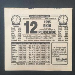 12 EKİM 1995 -TAKVİM YAPRAĞI-DOĞUM GÜNÜ HEDİYESİ-TÜRKİYE GAZETESİ TAKVİMİ,SOKOLLUNUN ŞEHADETİ 1579,ÖMER NASUHİ BİLMENİN VEFATI 1971,EKMEK,MODA, başlıklı ürün, Efemera, Müzik, Sinema > Belge ve Evraklar > Takvimler kategorisi altında İkinci El olarak satılmaktadır.