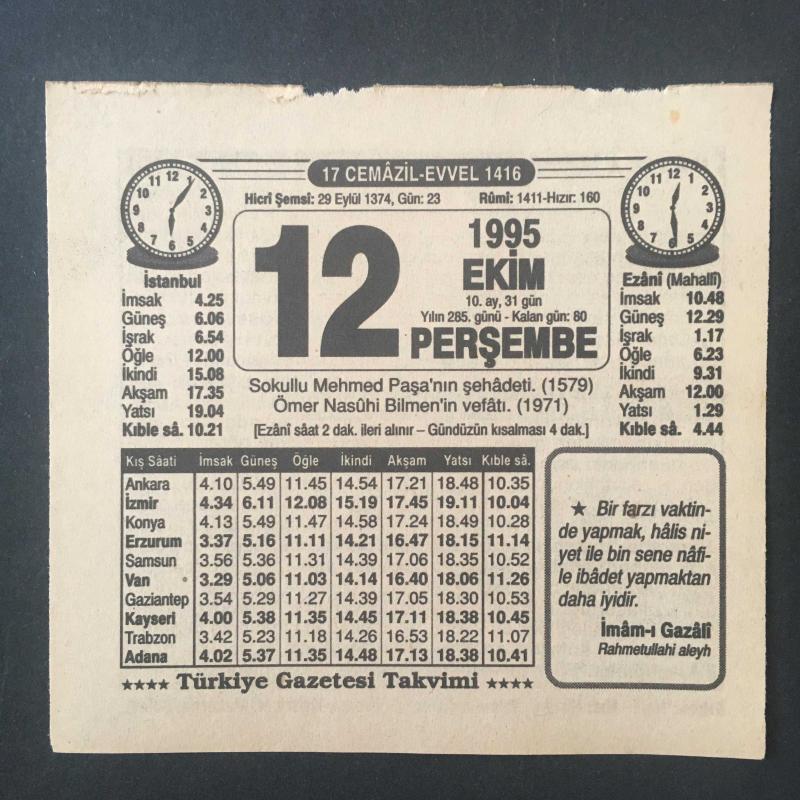 12 EKİM 1995 -TAKVİM YAPRAĞI-DOĞUM GÜNÜ HEDİYESİ-TÜRKİYE GAZETESİ TAKVİMİ,SOKOLLUNUN ŞEHADETİ 1579,ÖMER NASUHİ BİLMENİN VEFATI 1971,EKMEK,MODA,, en son 8 ay önce güncellenmiştir.