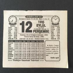 12 EYLÜL 1996 -TAKVİM YAPRAĞI-DOĞUM GÜNÜ HEDİYESİ-TÜRKİYE GAZETESİ TAKVİMİ,MUDANYA URLA KIRKAĞAÇIN KURTULUŞLARI 1922,ORDUNUN İDAREYİ ELE ALMASI 1980,İLK MÜSLÜMANLAR,PRATİK BİLGİLER başlıklı ürün, Efemera, Müzik, Sinema > Belge ve Evraklar > Takvimler kategorisi altında İkinci El olarak satılmaktadır.