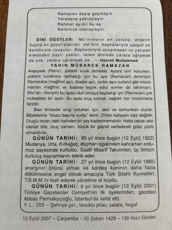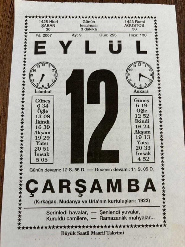 12 EYLÜL 2007 - TAKVİM YAPRAĞI - DOĞUM GÜNÜ HEDİYESİ - BÜYÜK SAATLİ MAARİF TAKVİMİ - HZ.MUHAMMED - YARIN MUBAREK RAMAZAN - MUDANYA,URLA,KIRKAĞAÇ DÜŞMAN İŞGALİNDEN KURTULDU - TÜRK SİLAHLI KUVVETLERİ YÖNETİME EL KOYDU - GAZETECİ ABBAS PARMAKSIZOĞLU VEFAT ETTİ