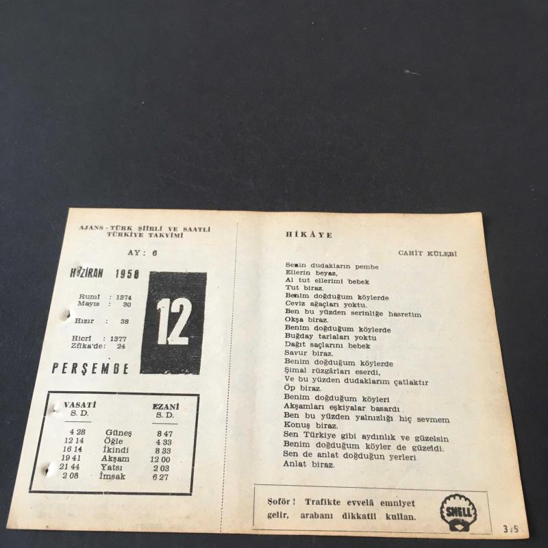 12 HAZİRAN 1958 -TAKVİM YAPRAĞI-DOĞUM GÜNÜ HEDİYESİ-AJANS-TÜRK ŞİİRLİ VE SAATLİ TÜRKİYE TAKVİMİ,CAHİT KÜLEBİ,ORHAN ERDİVANLI,FAL,FIKRA,CEZAYİRİN FRANSIZLAR TARAFINDAN İŞGALİ 1830,GÜZEL SÖZ,YEMEK LİSTESİ başlıklı ürün, Efemera, Müzik, Sinema > Belge ve Evraklar > Takvimler kategorisi altında İkinci El olarak satılmaktadır.