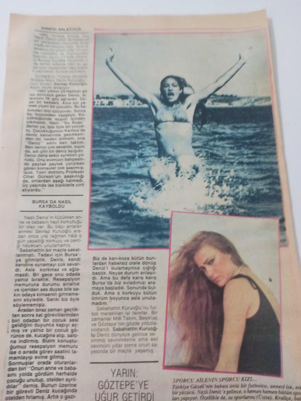 12 Haziran 1982 - 1982 Türkiye Güzeli olan Nazlı Deniz uzun ve çekişmeli bir yarışmanın sonunda böyle mutlu bir sonuca ulaştı. Ama dilerseniz biz şimdi yıllar öncesine uzanalım - Bursa'da Nasıl Kayboldu - Yarın: Göztepe'ye Uğur Getirdi - Gazete haberi - Tek Yaprak Arkalı Önlüdür, Erol Duru tarafından kaleme alınmıştır. Kitap 1982 yılında yayınlanmıştır. 2 sayfadır. 12 Haziran 1982 - 1982 Türkiye Güzeli olan Nazlı Deniz uzun ve çekişmeli bir yarışmanın sonunda böyle mutlu bir sonuca ulaştı. Ama dilerseniz biz şimdi yıllar öncesine uzanalım - Bursa'da Nasıl Kayboldu - Yarın: Göztepe'ye Uğur Getirdi - Gazete haberi - Tek Yaprak Arkalı Önlüdür adlı eser Türkçe dilindedir.