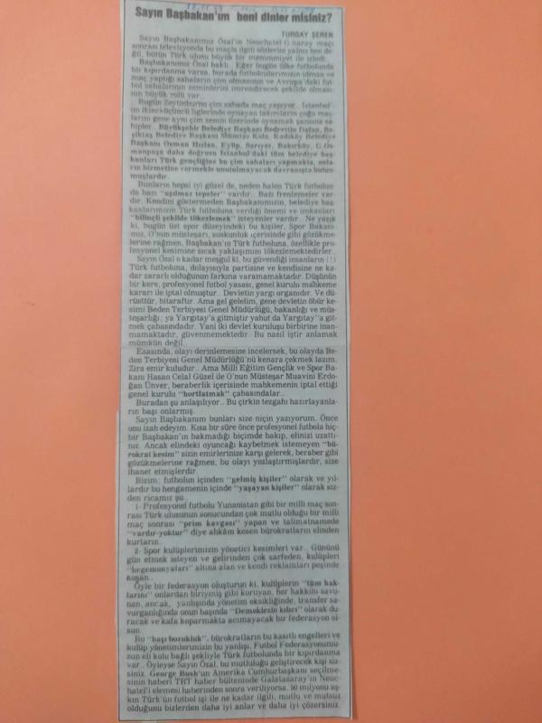 Kitap 1988 yılında yayınlanmıştır. 12 Kasım 1988 - Güneş Gazetesi - Sayın Başbakan'ın beni dinler misiniz? - Sayın Başbakanımız Özal'ın Neuchatel-Galatasaray maçı sonrası televizyonda bu maçla ilgili sözlerini yalnız ben değil, bütün Türk ulusu büyük bir memnuniyet ile izledi - Gazete tam değil kupürüdür - 7x24cm ebatındadır.. adlı eser Türkçe dilindedir.