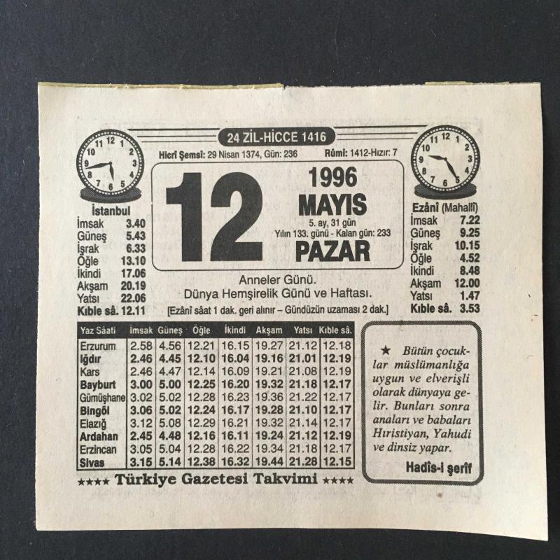 12 MAYIS 1996 -TAKVİM YAPRAĞI-DOĞUM GÜNÜ HEDİYESİ-TÜRKİYE GAZETESİ TAKVİMİ,ANNELER GÜNÜ,DÜNYA HEMŞİRELİK GÜNÜ VE HAFTASI,GÜL BABA,ANA KOŞMASI, 1 yıl önce satışa sunulmuştur.