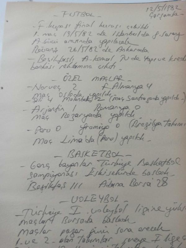 12 Mayıs 1982 - Genç bayanlar Türkiye Basketbol Şampiyonası Eskişehir'de başladı- Beşiktaş 111 Adana Borsa 28 - Türkiye 1. Voleybol ligine yükselme maçları Bursa'da başladı haberi - Islak kalemle a4 kağıdına yazılmış bilgi notu - Tek Yaprak Arkalı Önlüdür adlı eser, Kitap > Süreli Yayınlar > Dergiler > Spor kategorisinde İkinci El olarak satıştadır.