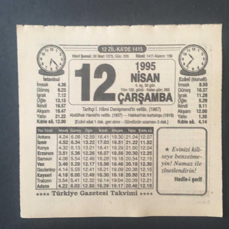 12 NİSAN 1995 -TAKVİM YAPRAĞI-DOĞUM GÜNÜ HEDİYESİ-TÜRKİYE GAZETESİ TAKVİMİ,TARİHÇİ İ.HAMİ DANİŞMEND İN VEFATI,1967,ABDULHAK HAMİD İN VEFATI 1937,HAKKARİNİN KURTULUŞU 1918,İSTANBUL,ÇANAK KÖFTE, en son 8 ay önce güncellenmiştir.