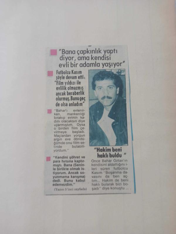 12 Nisan 1984 - Bahar Öztan'ın eski kocası futbolcu Kasım ''Bana çapkınlık yaptı diyor, ama kendisi evli bir adamla yaşıyor'' - ''Film yıldızı ile evlilik olmazmış ancak beraberlik olurmuş. Bunu geç de olsa anladım'' dedi - Gazete haberi - Tek Yaprak Arkalı Önlüdür adlı eser, Kitap > Süreli Yayınlar > Dergiler > Spor kategorisinde İkinci El olarak satıştadır.