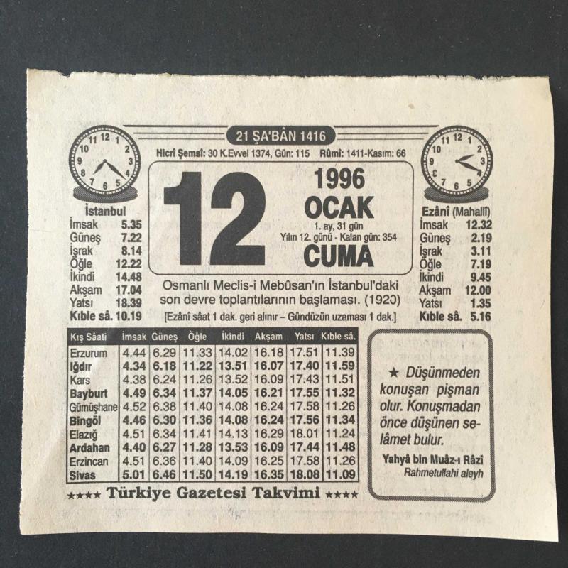 12 OCAK 1996-TAKVİM YAPRAĞI-DOĞUM GÜNÜ HEDİYESİ-TÜRKİYE GAZETESİ TAKVİMİ,OSMANLI MECLİSİ MEBUSANIN İSTANBULDAKİ SON DEVRE TOPLANTILARININ BAŞLAMASI 1920,İFFETİ KORUMAK başlıklı ürün, Efemera, Müzik, Sinema > Belge ve Evraklar > Takvimler kategorisi altında İkinci El olarak satılmaktadır.