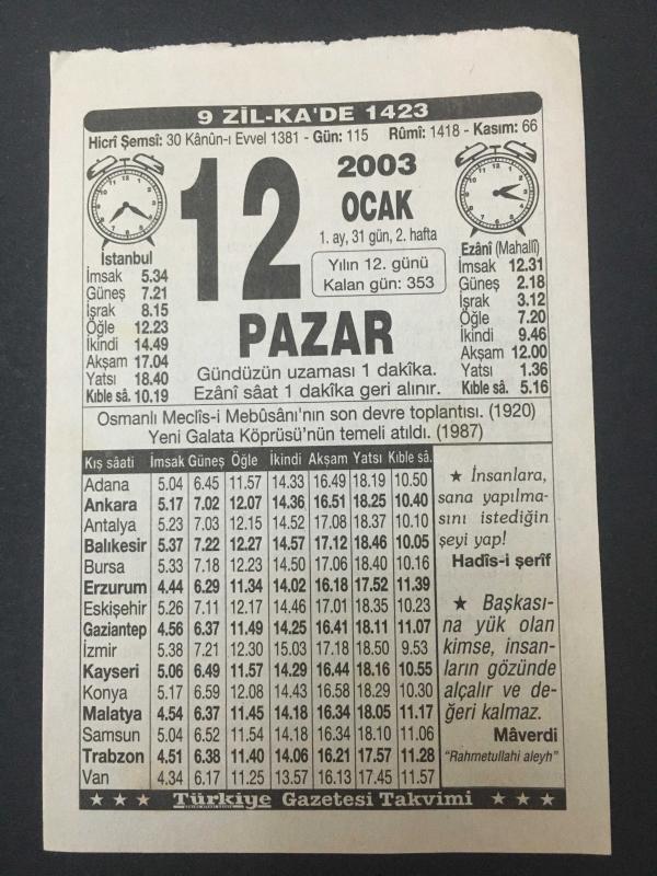 12 OCAK 2003-TAKVİM YAPRAĞI-DOĞUM GÜNÜ HEDİYESİ-TÜRKİYE GAZETESİ TAKVİMİ,OSMANLI MECLİSİ MEBUSANIN SON DEVRE TOPLANTISI,1920,GALATA KÖPRÜSÜNÜN TEMELİ ATILDI 1987, başlıklı ürün, Efemera, Müzik, Sinema > Belge ve Evraklar > Takvimler kategorisi altında İkinci El olarak satılmaktadır.