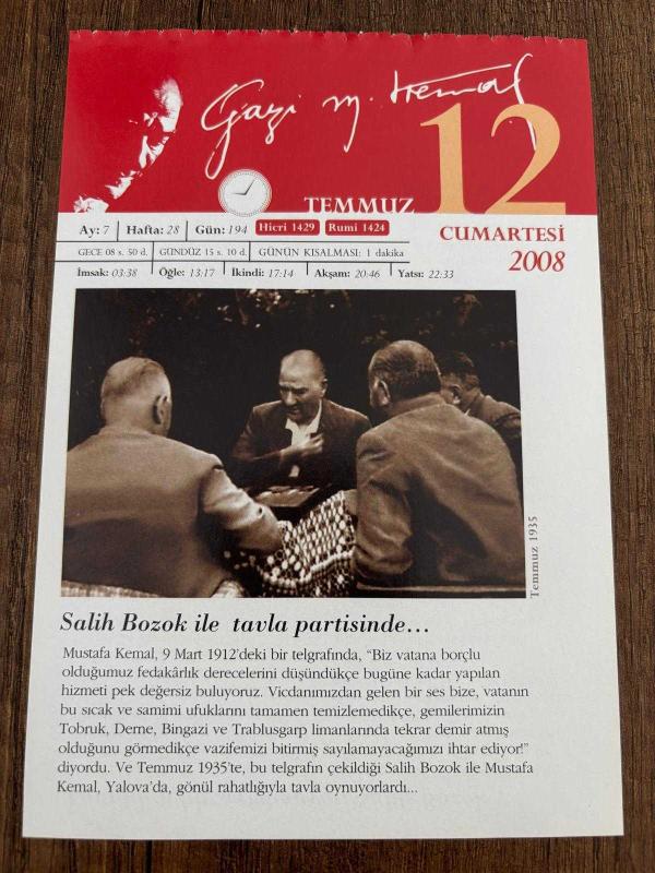 12 TEMMUZ 2008 - TAKVİM YAPRAĞI - DOĞUM GÜNÜ HEDİYESİ - GAZİ MUSTAFA KEMAL ATATÜRK FOTOĞRAFLI BÜYÜKÇEKMECE BELEDİYESİ TAKVİMİ - Salih Bozok ile tavla partisinde- 1975- Atatürk ile iki yıl evli kalan Latife Uşaklıgil 75 yaşında İstanbul'da öldü.- 1878- Osmanlı Devleti, Kıbrıs Adası yönetimini İngiltere'ye devretti., en son 9 ay önce güncellenmiştir.