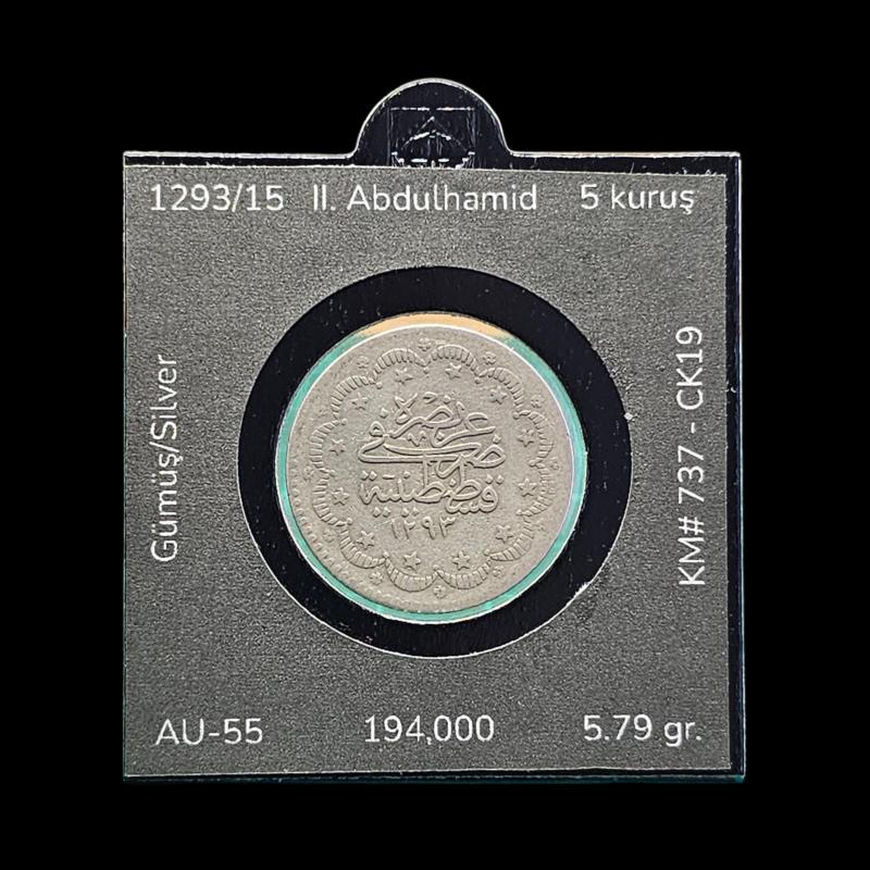 Sultan/Empire : II. Abdulhamid Para/Coin : 5 kuruş Hicri/AH : 1293 Cülus/Year : 15 Dönem/Period : 1876-1908 Miladi/AD : 1890 KM# : 737 Kondisyon : ÇÇT Condition : XF Basım Adedi / Mintage : 194,000 Darphane / Location : Kostantiniye Maden / Material : Gümüş/Silver Çap / Diameter(mm) : 23.59 Ağırlık / Weight (gr) : 5.79 Gümüş / AGW (gr) : 4.81