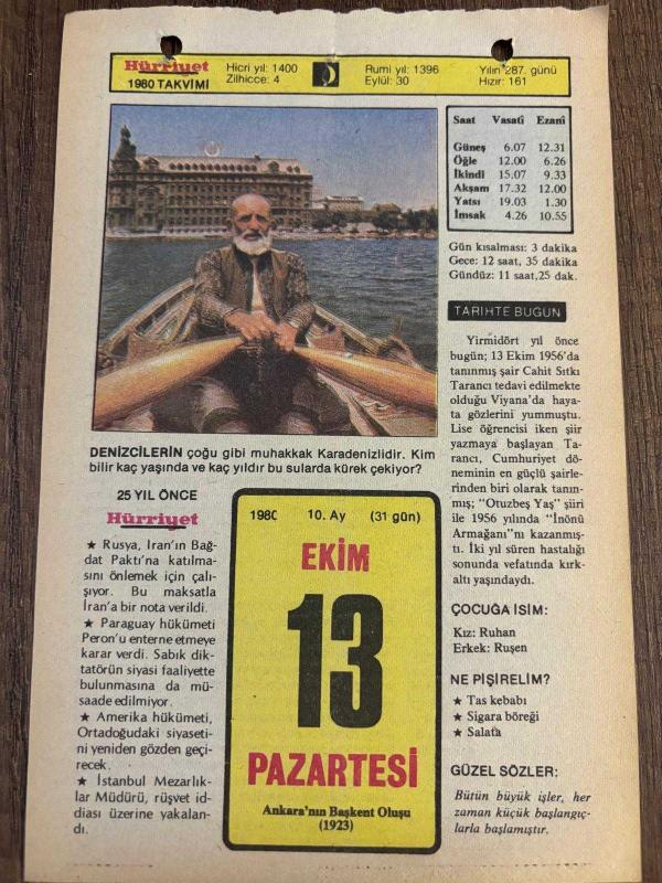 13 EKİM 1980 - TAKVİM YAPRAĞI - DOĞUM GÜNÜ HEDİYESİ - HÜRRİYET TAKVİMİ - DESTAN GİBİ ADLI ROMAN - Diyarbakır'da "Cahit Sıtkı Tarancı'yı Anma Günü" - Rusların Azak Türkleri'ne yenilgisi (1695), en son 8 ay önce güncellenmiştir.