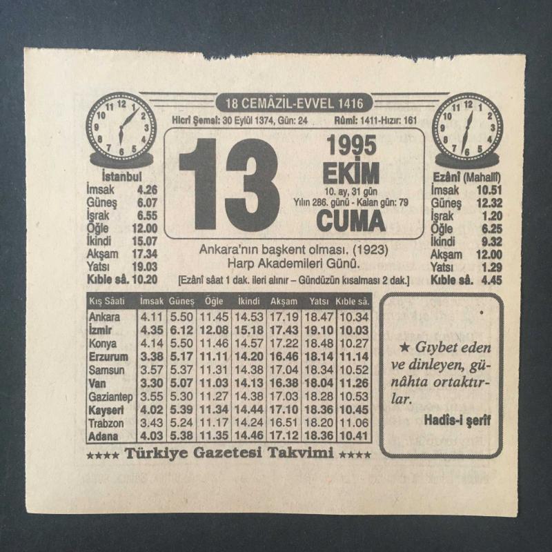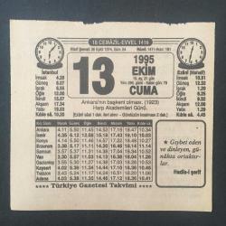 13 EKİM 1995 -TAKVİM YAPRAĞI-DOĞUM GÜNÜ HEDİYESİ-TÜRKİYE GAZETESİ TAKVİMİ,ANKARANIN BAŞKENT OLMASI 1923,HARP AKADEMİLERİ GÜNÜ ,DİNİMİZİ NEREDEN ÖĞRENELİM, en son 8 ay önce güncellenmiştir.