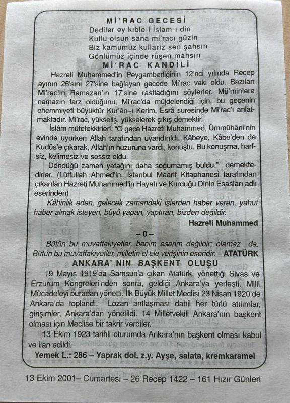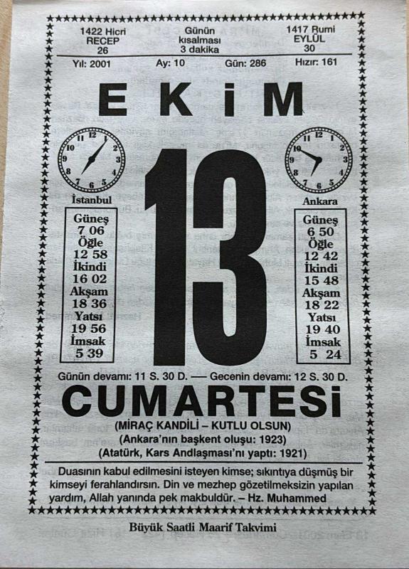 13 EKİM 2001 - TAKVİM YAPRAĞI - DOĞUM GÜNÜ HEDİYESİ - BÜYÜK SAATLİ MAARİF TAKVİMİ - HZ.MUHAMMED - Mİ'RAC GECESİ - ATATÜRK - ANKARA'NIN BAŞKENT OLUŞU, en son 8 ay önce güncellenmiştir.