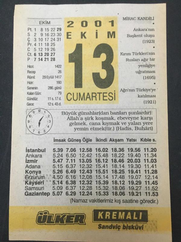 13 EKİM 2001-TAKVİM YAPRAĞI-DOĞUM GÜNÜ HEDİYESİ-ÜLKER TAKVİMİ,MİRAC KANDİLİ,ANKARANIN BAŞKENT OLUŞU, 1923,KIRIM TÜRKLERİNİN RUSLARI AĞIR YENİLGİYE UĞRATMASI,1695,AĞRININ TÜRKİYEYE KATILMASI,MİRAC KANDİLİ
