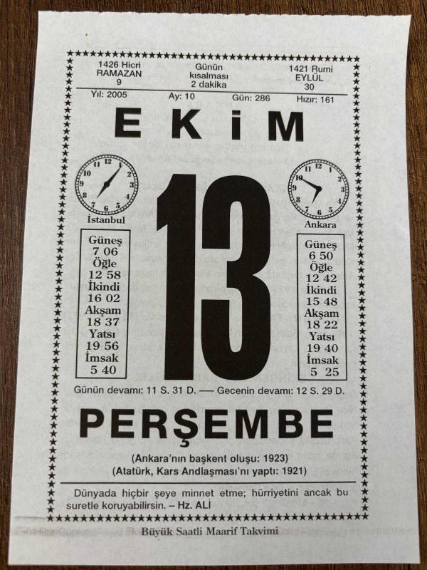 13 EKİM 2005 - TAKVİM YAPRAĞI - DOĞUM GÜNÜ HEDİYESİ - BÜYÜK SAATLİ MAARİF TAKVİMİ - HZ.ALİ - ANKARA BAŞKENT OLDU - ATATÜRK - YAZAR CEVAT ŞAKİR KABAAĞAÇ VEFAT ETTİ - DALE CARNEGİE