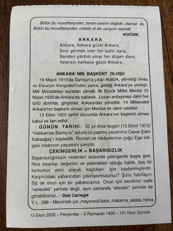 13 EKİM 2005 - TAKVİM YAPRAĞI - DOĞUM GÜNÜ HEDİYESİ - BÜYÜK SAATLİ MAARİF TAKVİMİ - HZ.ALİ - ANKARA BAŞKENT OLDU - ATATÜRK - YAZAR CEVAT ŞAKİR KABAAĞAÇ VEFAT ETTİ - DALE CARNEGİE, en son 8 ay önce güncellenmiştir.