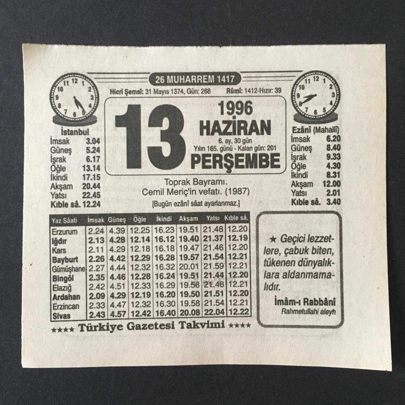 13 HAZİRAN 1996 -TAKVİM YAPRAĞI-DOĞUM GÜNÜ HEDİYESİ-TÜRKİYE GAZETESİ TAKVİMİ,TOPRAK BAYRAMI,CEMİL MERİÇİN VEFATI 1987,BU VATAN KİMİN,TERAYAĞI başlıklı ürün, Efemera, Müzik, Sinema > Belge ve Evraklar > Takvimler kategorisi altında İkinci El olarak satılmaktadır.