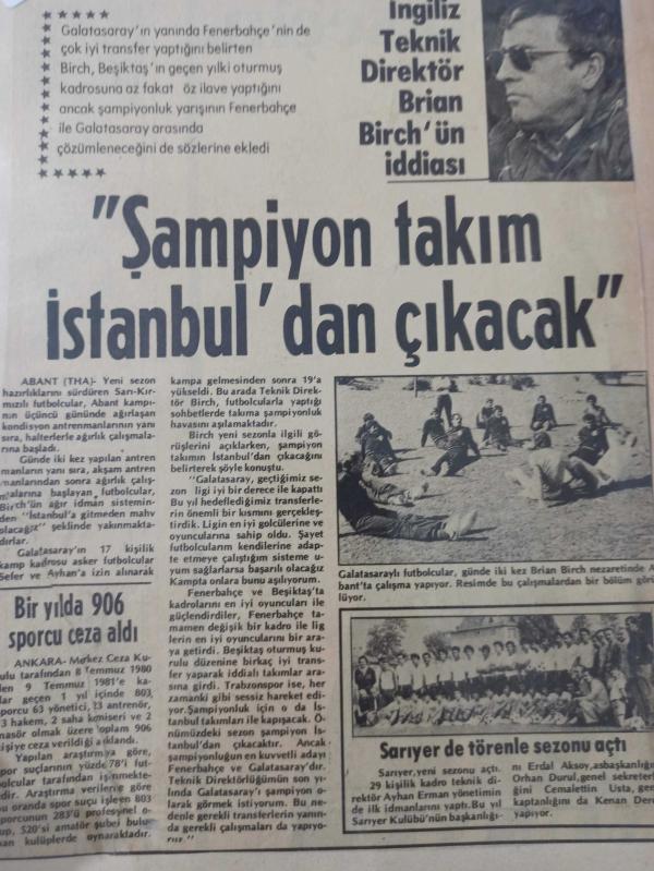 13 Haziran 1981 - İngiliz Teknik Direktörü Brian Birch'ün iddiası - ''Şampiyon takım İstanbul'dan çıkacak'' - Bir yılda 906 sporcu ceza aldı - Sarıyer de törenle sezonu açtı - Gazete haberi - Tek Yaprak Arkalı Önlüdür, Erol Duru tarafından kaleme alınmıştır. Kitap 1981 yılında yayınlanmıştır. 2 sayfadır. 13 Haziran 1981 - İngiliz Teknik Direktörü Brian Birch'ün iddiası - ''Şampiyon takım İstanbul'dan çıkacak'' - Bir yılda 906 sporcu ceza aldı - Sarıyer de törenle sezonu açtı - Gazete haberi - Tek Yaprak Arkalı Önlüdür adlı eser Türkçe dilindedir.