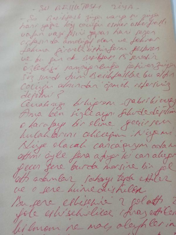 13 Haziran 1982 - Şu Beşiktaşlı Ziya varya şu Ziya hani yağız köy çocuğu esmer asker traşlı vatan vazifesini yapan hani sezon ortasında ameliyat olan ve tekrar takıma girerek üstün form gösteren ve bu gün de Beşiktaş'ı 15 senedir özlediği şampiyonluğu getirdi haberi - Islak kalemle a4 kağıdına yazılmış bilgi notu - Tek Yaprak Arkalı Önlüdür, Erol Duru tarafından kaleme alınmıştır. Kitap 1982 yılında yayınlanmıştır. 2 sayfadır. 13 Haziran 1982 - Şu Beşiktaşlı Ziya varya şu Ziya hani yağız köy çocuğu esmer asker traşlı vatan vazifesini yapan hani sezon ortasında ameliyat olan ve tekrar takıma girerek üstün form gösteren ve bu gün de Beşiktaş'ı 15 senedir özlediği şampiyonluğu getirdi haberi - Islak kalemle a4 kağıdına yazılmış bilgi notu - Tek Yaprak Arkalı Önlüdür adlı eser Türkçe dilindedir.