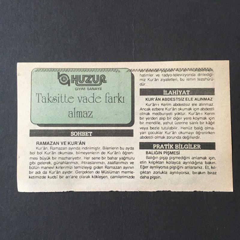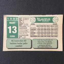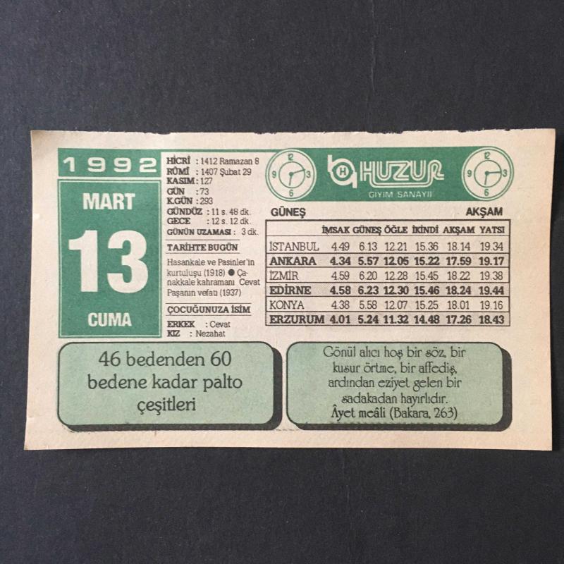 13 MART 1992 -TAKVİM YAPRAĞI-DOĞUM GÜNÜ HEDİYESİ-HUZUR TAKVİMİ,HASANKALE VE PASİNLERİN KURTULUŞU 1918,ÇANAKKALE KAHRAMANI CEVAT PAŞANIN VEFATI 1937,ÇOCUĞUNUZA İSİM,RAMAZAN VE KUR AN,KUR AN ABDESTSİZ ELE ALINMAZ,BALIĞIN PİŞMESİ başlıklı ürün, Efemera, Müzik, Sinema > Belge ve Evraklar > Takvimler kategorisi altında İkinci El olarak satılmaktadır.