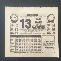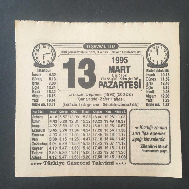 13 MART 1995 -TAKVİM YAPRAĞI-DOĞUM GÜNÜ HEDİYESİ-TÜRKİYE GAZETESİ TAKVİMİ,ERZİNCAN DEPREMİ 500 ÖLÜ,1992,ÇANAKKALE ZAFER HAFTASI,SEBZELERİN TEMİZLENMESİ,BEKLEMEYİN başlıklı ürün, Efemera, Müzik, Sinema > Belge ve Evraklar > Takvimler kategorisi altında İkinci El olarak satılmaktadır.