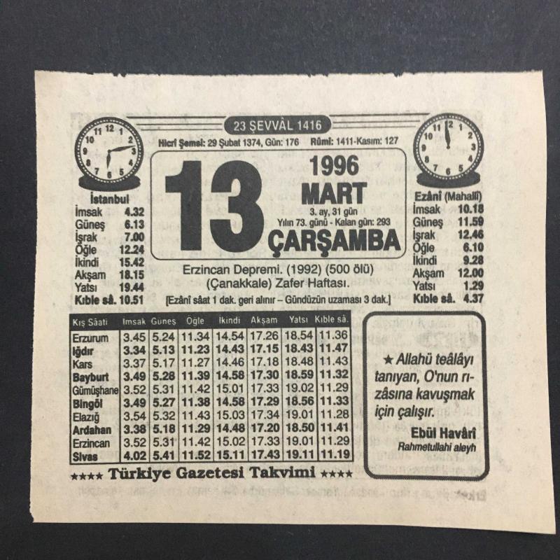 13 MART 1996 -TAKVİM YAPRAĞI-DOĞUM GÜNÜ HEDİYESİ-TÜRKİYE GAZETESİ TAKVİMİ,ERZİNCAN DEPREMİ 1992,ÇANAKKALE ZAFER HAFTASI,ASPİRİN,UN HELVASI, en son 8 ay önce güncellenmiştir.