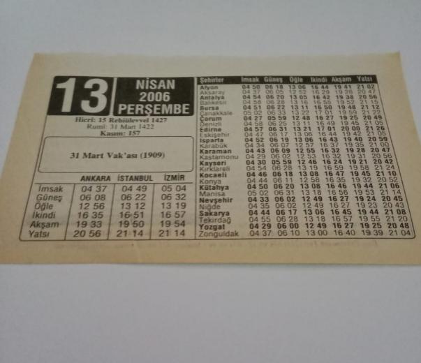 13 Nisan 2006-Orijinal Takvim Yaprağı-Doğum Günü-Söz,Nişan,Nikâh,Düğün ve Önemli Günler Hediyesi-ERAŞ Hizmet Takvimi-Ayet-Hadis(31 Mart Vak'ası(1909))-Çıkık-Çocuğunuza İsim:Oğuz,Okşan, en son 3 ay önce güncellenmiştir.