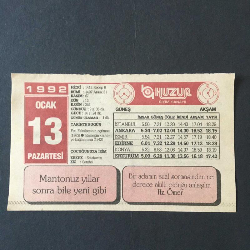 13 OCAK 1992 -TAKVİM YAPRAĞI-DOĞUM GÜNÜ HEDİYESİ-HUZUR TAKVİMİ,FEN FAKÜLTESİNİN AÇILMASI 1863,EKMEĞİN KARNEYE BAĞLANMASI ,ÇOCUĞUNUZA İSİM,SADAKAT BURCU HZ.EBU BEKİR 2, başlıklı ürün, Efemera, Müzik, Sinema > Belge ve Evraklar > Takvimler kategorisi altında İkinci El olarak satılmaktadır.
