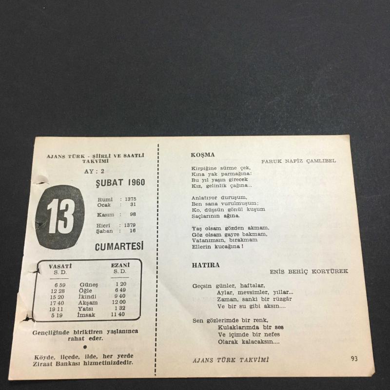 13 ŞUBAT 1960 -TAKVİM YAPRAĞI-DOĞUM GÜNÜ HEDİYESİ-AJANS TÜRK-ŞİİRLİ VE SAATLİ TAKVİMİ,FARUK NAFIZ ÇAMLIBEL,ENİS BEHİÇ KORYÜREKÖMER BEDRETTİN UŞAKLI,SEMİHA ZİLAYAZ,İLHAN DEMİRASLAN,FAL,FIKRA,WAGNERİN ÖLÜMÜ 1883,SAHNE SANATKARLARIMIZDAN NEYYİRE ERTUĞRULUN ÖLÜMÜ 1943,GÜZEL SÖZ,YEMEK LİSTESİ, 1 yıl önce satışa sunulmuştur.