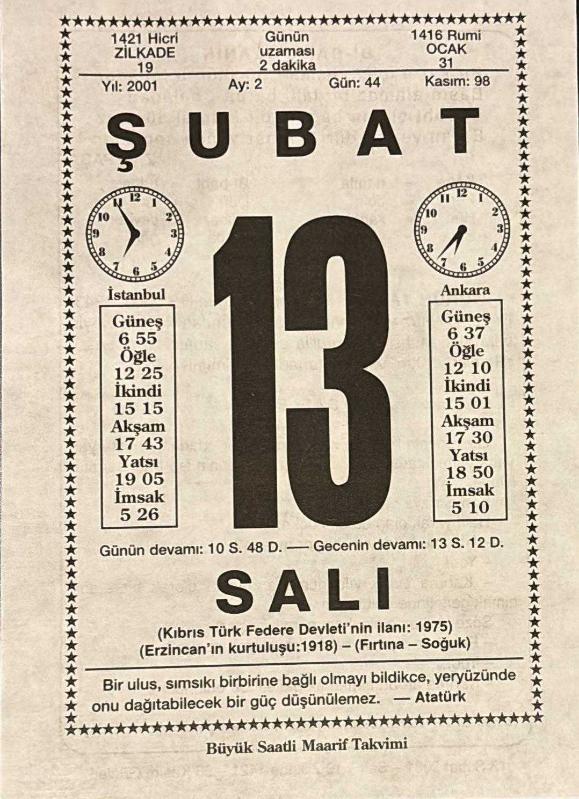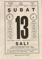 13 ŞUBAT 2001 - TAKVİM YAPRAĞI - DOĞUM GÜNÜ HEDİYESİ - BÜYÜK SAATLİ MAARİF TAKVİMİ - ATATÜRK - ZİYA PAŞA - NEYYİRE NEYİN'İN VEFATI - GAFLET ADLI KISA YAZI, en son 8 ay önce güncellenmiştir.