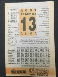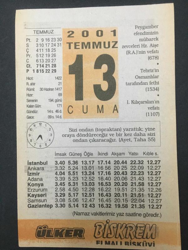 13 TEMMUZ 2001-TAKVİM YAPRAĞI-DOĞUM GÜNÜ HEDİYESİ-ÜLKER TAKVİMİ,HZ.AİŞENİN R.A VEFATI 678,TEBRİZİN OSMANLILAR TARAFINDAN FETHİ 1534,1.KILIÇARSLANIN VEFATI 1107,HAREZMİ 850 başlıklı ürün, Efemera, Müzik, Sinema > Belge ve Evraklar > Takvimler kategorisi altında İkinci El olarak satılmaktadır.