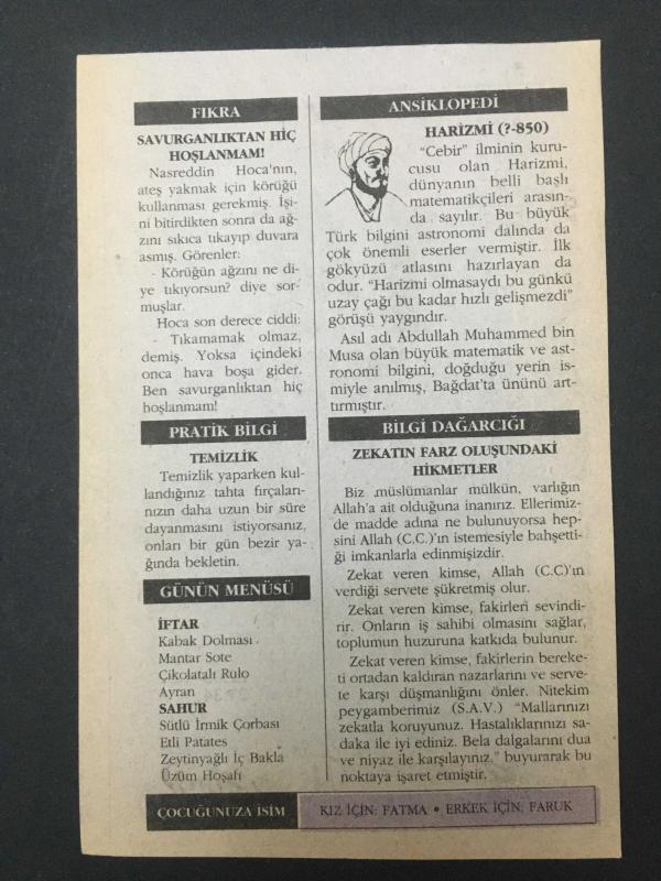 13 TEMMUZ 2001-TAKVİM YAPRAĞI-DOĞUM GÜNÜ HEDİYESİ-ÜLKER TAKVİMİ,HZ.AİŞENİN R.A VEFATI 678,TEBRİZİN OSMANLILAR TARAFINDAN FETHİ 1534,1.KILIÇARSLANIN VEFATI 1107,HAREZMİ 850, en son 8 ay önce güncellenmiştir.