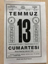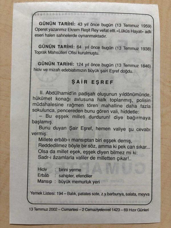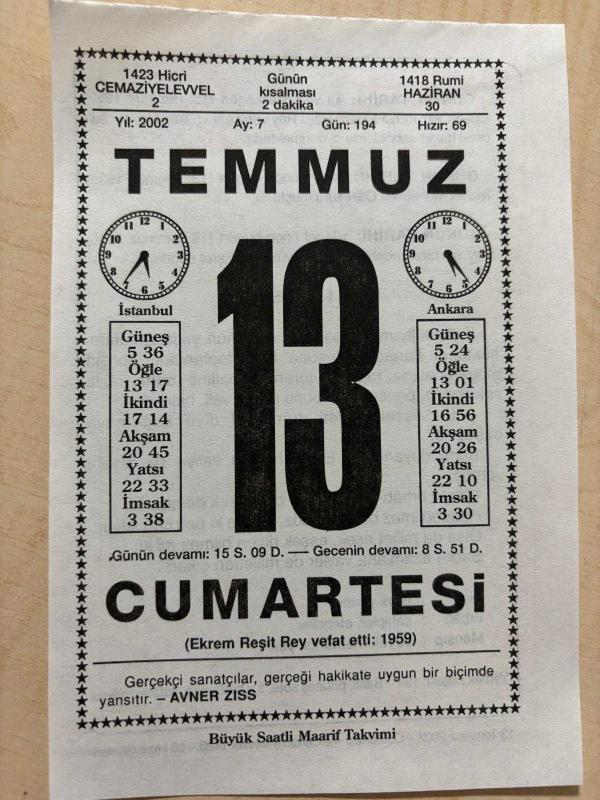 13 TEMMUZ 2002 - TAKVİM YAPRAĞI - DOĞUM GÜNÜ HEDİYESİ - BÜYÜK SAATLİ MAARİF TAKVİMİ - AVNER ZISS - ŞAİR EŞREF DOĞDU - TOPRAK MAHSULLERİ OFİSİ KURULDU - OPERET YAZARIMIZ EKREM REŞİT REY'İN VEFATI - ŞAİR EŞREF, en son 8 ay önce güncellenmiştir.